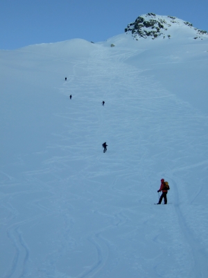von wo wir die Furcola Sura da Lavaz, den Übergang in die Greina, sehen konnten (Sattel in der Bildmitte). Wir planten, morgen diesem Pass einen Besuch abzustatten und einen Blick in die Greina zu werfen. Die Schneeverhältnisse waren top. Der Schnee war fester als gestern und gab guten Halt, so dass sich auch die Unsicheren unter uns in dieser ungewohnten Art sich fortzubewegen immer sicherer fühlten.