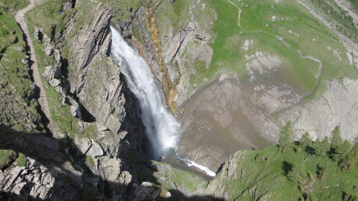 Aus der Seilbahnkabine und von der Aussichtsplattform neben der Bergstation blickt man auf die stiebenden Engstligenfälle. Hier im Bild der obere Wasserfall mit einer Stufenhöhe von 97 Metern (der untere Engstligenfall weist sogar eine Stufenhöhe von 165 Metern auf):