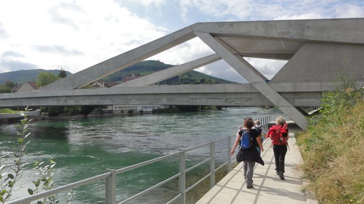 Auf dem vor zwei Jahren eröffneten neuen Gäubahnsteg überqueren wir die Aare und haben die markante Hausmattbrücke neben uns, Teil einer Entlastungsstrasse, die im nächsten Jahr vollständig eröffnet werden soll. Den Hügel links im Bild (mit der Ruine Wartburg und dem Sälischlössli) werden wir am Nachmittag von Aarburg her besteigen: