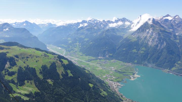 Im Süden und 1500 Meter tiefer liegt das Urner Reusstal; darüber im Vordergrund die Sonnenterrasse Eggbergen, die mit einer Luftseilbahn von Flüelen her erreichbar ist:
