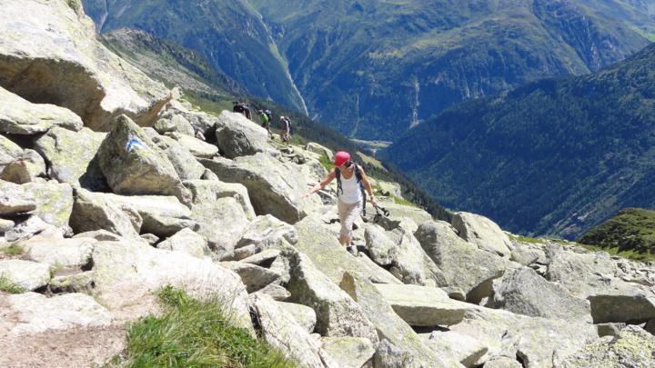 Je näher wir der Salbitbrücke kommen, umso ruppiger wird der Weg. Er führt über grosse Steinblöcke und weist anschliessend auch etwas ausgesetztere Passagen am steilen Abhang auf: