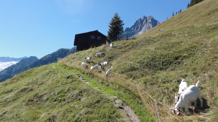 Nach einer Stunde, auf der Alp Regliberg, haben wir die ersten 500 Höhenmeter hinter uns; hier treffen alter und neuer Hüttenweg zusammen:
