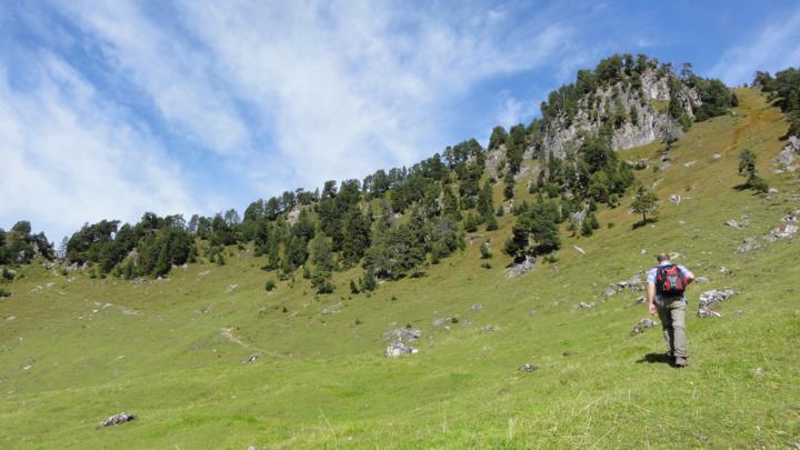 Über die Alp Roggen erreichen wir den Gratsattel (links im Bild). Von dort ist der Gipfel in einer Viertelstunde erklommen: