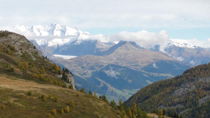 Beim Blick zurück Richtung Nordosten können wir einen kleinen Abschnitt des Grossen Aletschgletschers erkennen; rechts davor liegt das Gebiet von Riederalp / Bettmeralp. Die Gipfel über dem Gletscher müssten wohl jene östlich von Eiger, Mönch und Jungfrau sein (Fiescherhorn, Finsteraarhorn?):