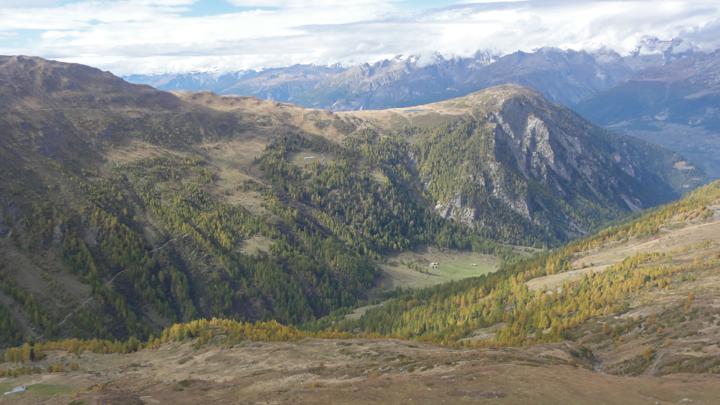 Auf der gegenüberliegenden Talseite ist der Suonenweg, den wir gegangen sind, als gerade horizontale Linie zu erkennen: