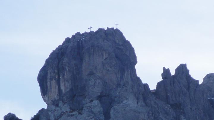 Allfällige Gipfelstürmer müssen sich bei 100 km/h-Windböen an einem der Drei-Schwestern-Gipfelkreuzen vermutlich gut festhalten: