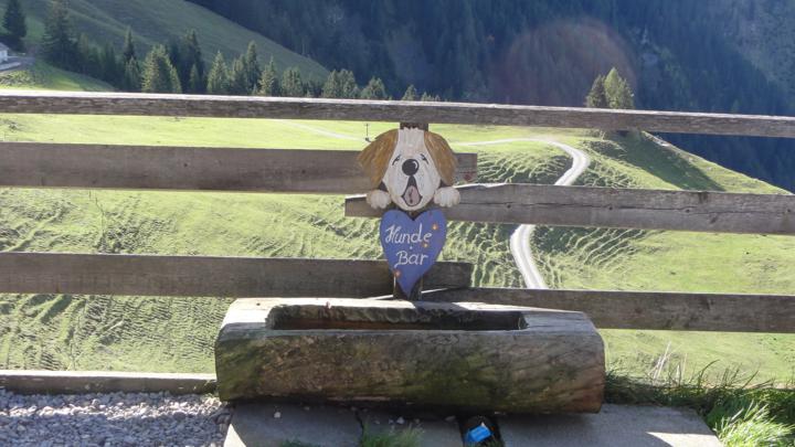 Etwas oberhalb des Vorderälpele (beim Kartenpunkt 1315m) wird uns vor einer eigentlich bereits geschlossenen Alphütte ein Getränk serviert, das nicht Flügel sondern Räder verleihen soll. Das könnte für den bevorstehenden 800-Meter-Abstieg nach Feldkirch von Vorteil sein (Bild geknipst von Monika):