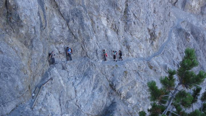 Rund eine halbe Stunde nach dem Wanderstart beginnt die eigentliche Passage des Fürstensteigs, des Felsenwegs in der Westflanke des Alpspitz: