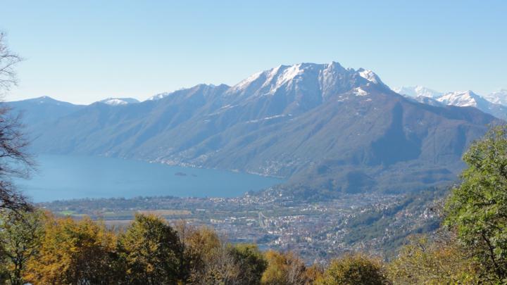 Blick über das Maggiadelta in Richtung Locarno / Ascona. Die Schneegrenze liegt bei rund 1000 Metern, ich werde sie weiter oben knapp erreichen: