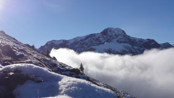 Mit zunehmender Höhe verschwinden die Nebelwolken aus dem Bild und dem Blick auf ein ungestörtes Bergpanorama steht nichts mehr im Weg (hinten dem Zingelgrat vermutlich der Urirotstock):