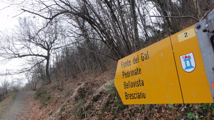 Eigentlich wollte ich dem Nordhang des Bosco Penz entlang bis kurz vor Bresciano gehen und von dort zur Kirche Santo Stefano aufsteigen. Etwa auf halbem Weg stosse ich aber auf diese Abzweigung nach links und auf einen Weg, der noch nicht in der Karte eingezeichnet ist. Ich bin gwundrig, wo er mich hinführen wird: