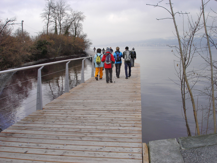 Ein Wanderblog hat nicht zuletzt den Zweck, dass er die LeserInnen dazu motivieren soll, die beschriebene Route auch einmal zu begehen. Dieser Blog ist insofern etwas differenziert, indem er darauf hinweist, es nicht so zu tun, wie wir es erlebten! Denn zu schlecht waren unsere Erfahrungen auf der Teilstrecke zwischen Freienbach und Richterswil bis zur Mülenen: Wir folgten den offiziellen Wegweisern — wo es denn welche hatte — und wurden auf eine Riesen-Umwegschlaufe durch Wollerau/Bäch geführt, die zu 95% über Hartbelag führte. Die Empfehlung lautet deshalb, bis zur Fertigstellung des gesamten Zürichsee-Uferwegs für die Strecke zwischen Pfäffikon (SZ) bis Richterswil die Bahn zu nehmen, sofern die Stege von Rapperswil und Richterswil am selben Tag besucht werden sollen. Als Kompensation könnte die Wanderung ab Wädenswil bis Oberrieden oder Horgen auf dem bestehenden Uferweg fortgesetzt werden. Ansonsten war es eine schöne Wanderung in angenehmer Gesellschaft, die auch die durchaus schönen Momente und Highlights dieser Wanderung bei überraschend angenehmen Temperaturen zu würdigen wusste.