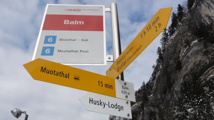 Wir gehen von der Husky-Lodge wieder ein Stück zurück, überqueren die Muota auf einer richtigen Brücke und kommen beim Wegpunkt "Balm 639m" auf die Strasse, die ins Bisistal hineinführt: