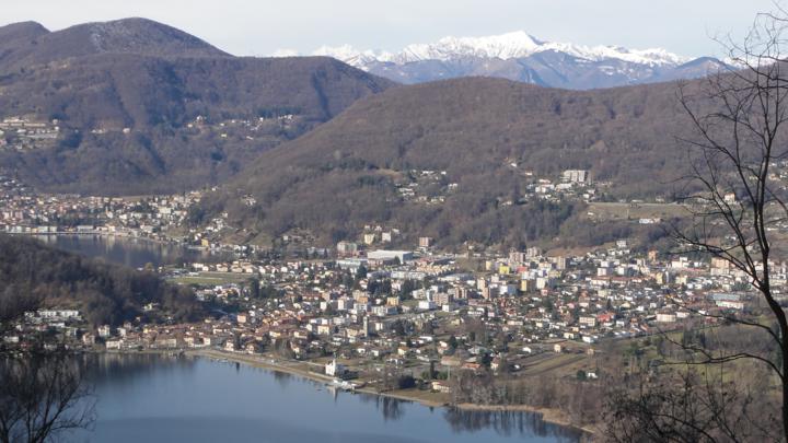 Links oben der Gipfel des Monte San Salvatore, vorne das Dorf Carabbia: