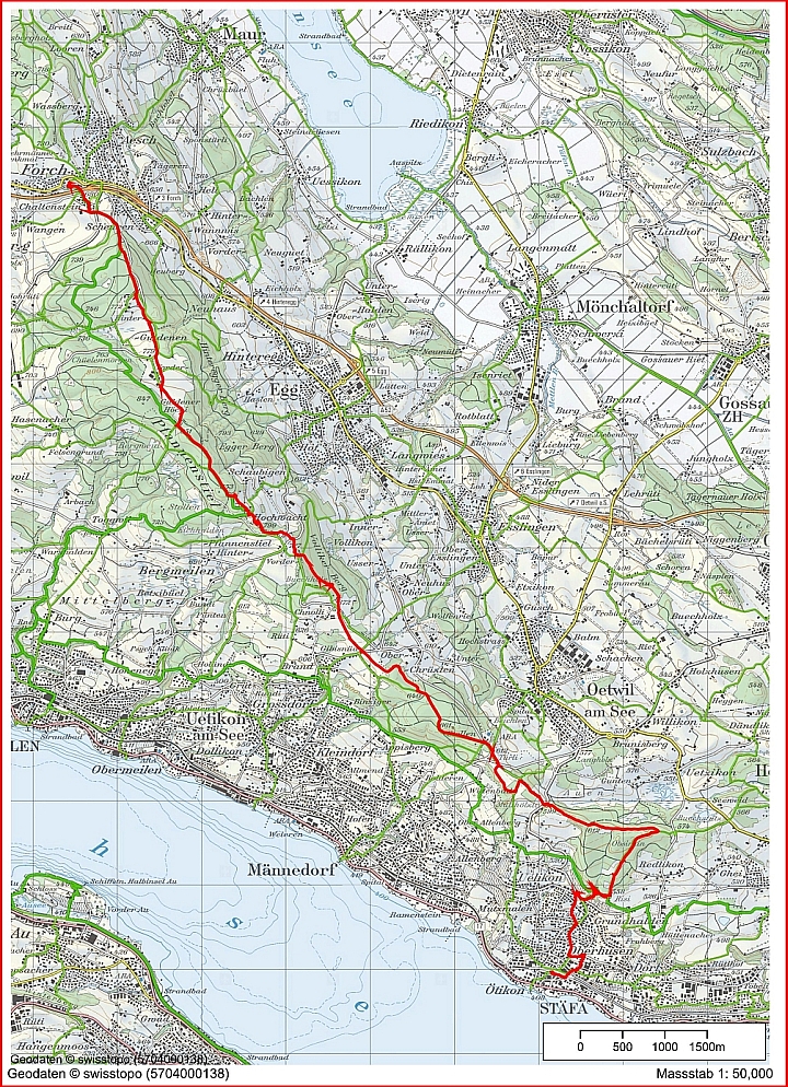 Heutige ROUTE: Forch Bahnhof (689m) - Hinter Guldenen (772m) - Vorder Guldenen (794m) - Guldener Höchi (842m) - Pfannenstiel (840m) - Hochwacht / Okenshöhe (803m) - Vorder Pfannenstiel (727m) - Volliker Berg - Chrüzlerboden (640m) - Stollen - Türli (615m) - Mülihölzli (598m) - Risi (560m) - Risitobel - Stäfa Bahnhof (413m)