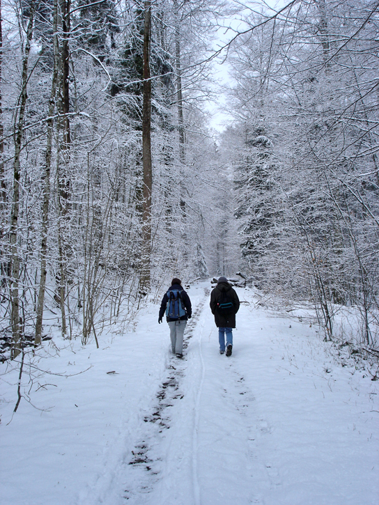 Wir steigen den glitschigen und manchmal vereisten steilen Weg in Richtung Station Sihlwald ab, um...