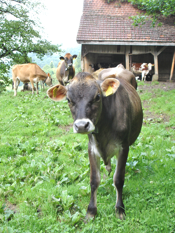 Via die Ger erreichen wir die Wolfsgrueb, wo uns ein tierisches Empangskomitee begrüsst. Wir steigen ab...