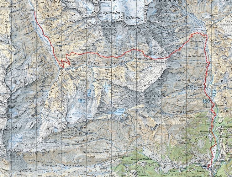 Im September 2007 sind Ernst und ich in zwei Tagen von Pardatsch am Lukmanierpass über den Pass d'Uffiern zur Scalettahütte und weiter über den Greinapass und die Hochebene und über den Pass Diesrut nach Vrin. Dies war eine ganz tolle Tour und wir hatten schon lange beide den Wunsch nochmals über den Pass d'Uffiern zu gehen. In einem Tag ist das fast nicht möglich da man von Zürich anreisend erst etwa um 10 Uhr 20 bei Pardatsch ist. Die von uns vorgesehene Route ist auf keiner Wanderkarte mehr zu finden. Vor etwa 10 Jahren wurde eine neue Route zum Pass d'Uffiern angelegt mit Start bei der Bovarinahütte. Dies ist der Sentiero dei stambecchi.