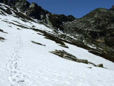 Nach wenigen weiteren Höhenmetern wurde die Wegsuche durch diese Halde durch die ersten grösseren Schneefelder erschwert. Währenddem sich Brigitte und Thomas als Pfadfinder/Pfadfinderin profilierten, konnten Yvonne und ich in aller Ruhe ihren Spuren folgen... Als wir den Passo "ohne Namen" erreichten, hatten wir 1400 Höhenmeter überwunden! Die Aussicht oben auf dem Pass war unvergleichlich!!