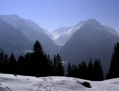 Auf der linken Seite des Sees marschieren wir ein Stück durch den Wald, auf den Spuren die von Schneeschuhwanderern gemacht wurden, und erreichen ohne grosse Anstrengung den Aussichtspunkt oberhalb von Hinter Arni. Von hier haben wir eine schöne Aussicht auf die Gipfel entlang dem Reusstal in Richtung Süden. Ganz im Hintergrund sind die Gipfel der Göscheneralp zu sehen, an denen sich die Wolken aus dem Tessin stauen.