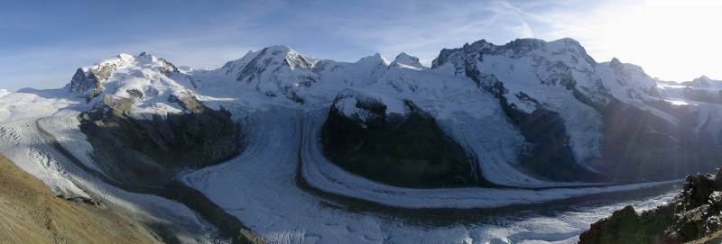 Auf der Suche nach einem etwas geschützten Rastplatz steigen wir auf eine kleine Erhebung hinauf und finden ein Plätzchen mit traumhafter Aussicht. Im Südosten sehen wir den Weissgrat mit dem oberen Teil des Gornergleteschers, das Monte Rosa Massiv mit dem höchsten Gipfel der Schweiz, der Dufourspitze. Der Liskamm, an dem die Eismassen des Grenzgletschers entstehen, der Castor und die Zwillinge mit dem Zwillingsgletscher.