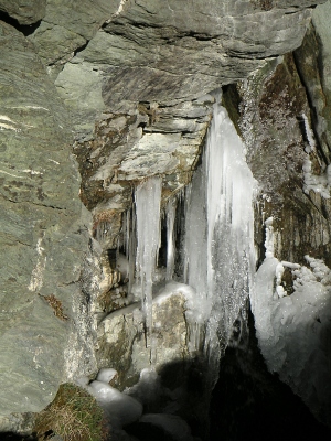 Auf dem flachen Weg, etwas oberhalb des gefrorenen Bachlaufs des Triftbachs, erreichen wir bald eine natürliche Brücke, auf der wir den Bachlauf bei Stellistein überqueren wollen.