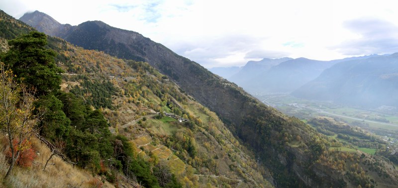 Wir verlassen das Jolibachtal wieder und nachdem wir die Flanke oberhalb von Raron passiert haben, können wir nun auch das Rhonetal in östlicher Richtung bis nach Visp überblicken. Links im Bild sehen wir die Bergflanke und den Grat, die den unteren Teil des Bietschtals abgrenzen.