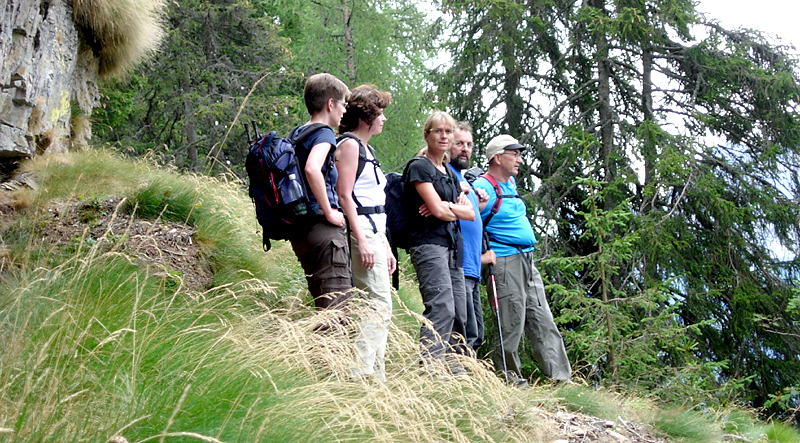 der Weg wird jetzt auch steiniger und mit Wurzeln und es folgt ein kurzer aber happiger Aufstieg zum höchsten Punkt der Wanderung, Fragéira. Bevor wir aber diesen Punkt erreichen machen wir ein bischen abseits des Weges, unsere Mittagspause. Eigentlich ist der Rastplatz nicht wirklich exponiert, aber jetzt, wo wir Pause machen spüren wir alle den kühlen Wind. Sogar den Pullover müssen sich einige von uns anziehen. Es sind nur noch ca. 100m aufzusteigen um dann nach dem höchsten Punkt wieder mit dem Abstieg zu beginnen. Und wieder kommen wir zu einer grösseren Alpweide wo wir wieder die Aussicht auf die andere Talseite geniessen können.